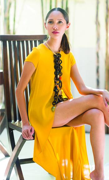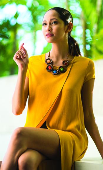 Own the conversation in the room with this interesting ensemble of Kamagong wood links and semi-precious stones with adjustable leather strings, paired with a lightweight piece to complete that chic casual look.